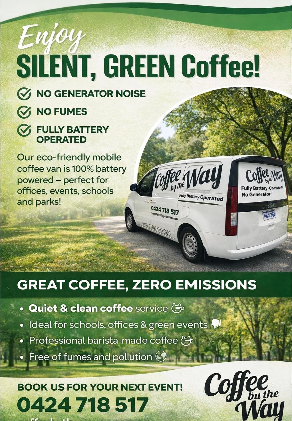 Welcome to Coffee by the Way, Perth's premier mobile coffee experience. We bring award-winning, freshly made barista coffees directly to your workplace, community events, home opens, and more. Enjoy premium coffee without the noise and fumes. we're fully battery powered!